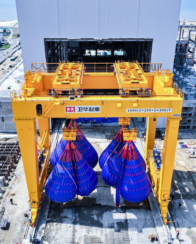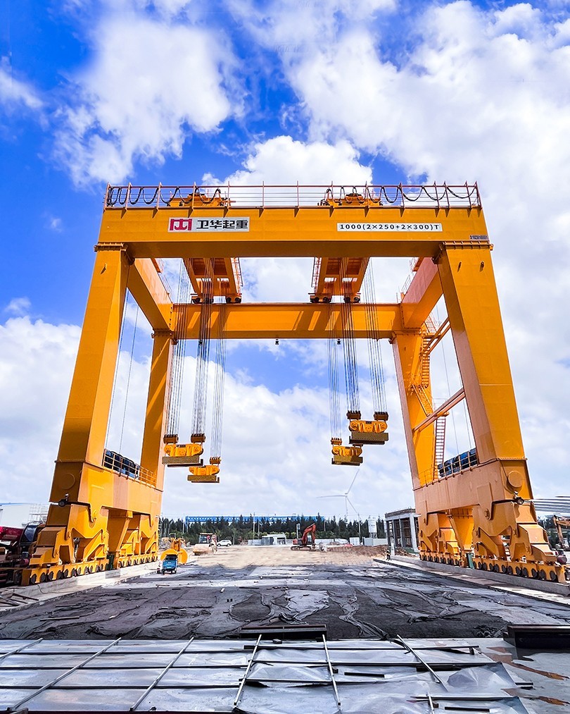 根据项目起吊重量大、工况复杂、控制精度高等特点,beats365起重机采用U型门架结构,双龙门四点吊装,最大起吊重量1000t,最大吊点高度大于18m,采用变频+PLC控制,可实现横向、纵向距离可调,及吊梁自由旋转,控制精度达±1mm。