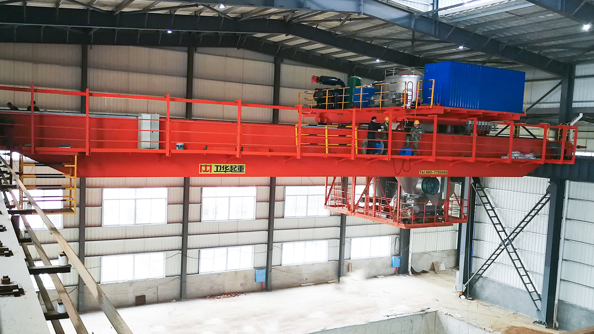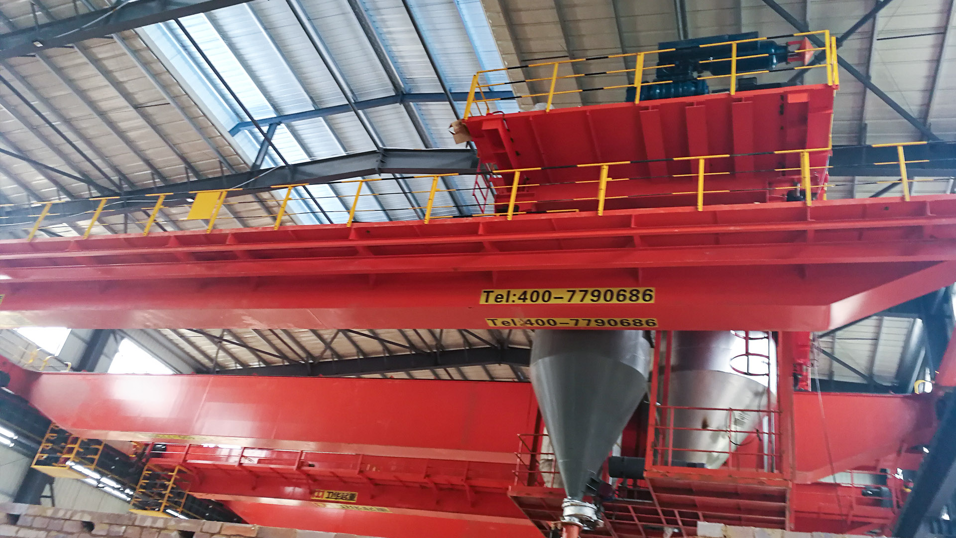 (5)其它辅助吊运工作 在小车上装有辅助吸料管,可清扫烟道、排除粉尘;在桥架上备有10t电动葫芦,进行燃烧器的搬运及焙烧炉的维修保养工作。
